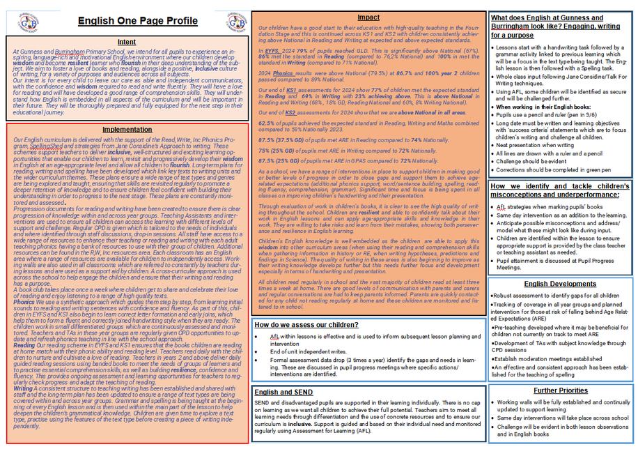 Through evaluation of work in children’s books at Gunness and Burringham C of E Primary School, it is clear to see the high quality of writing throughout the school. Children are resilient and able to confidently talk about their work in English lessons and can apply age-appropriate skills and knowledge in their work. They are willing to take risks and learn from their mistakes, showing both perseverance and resilience in English learning.